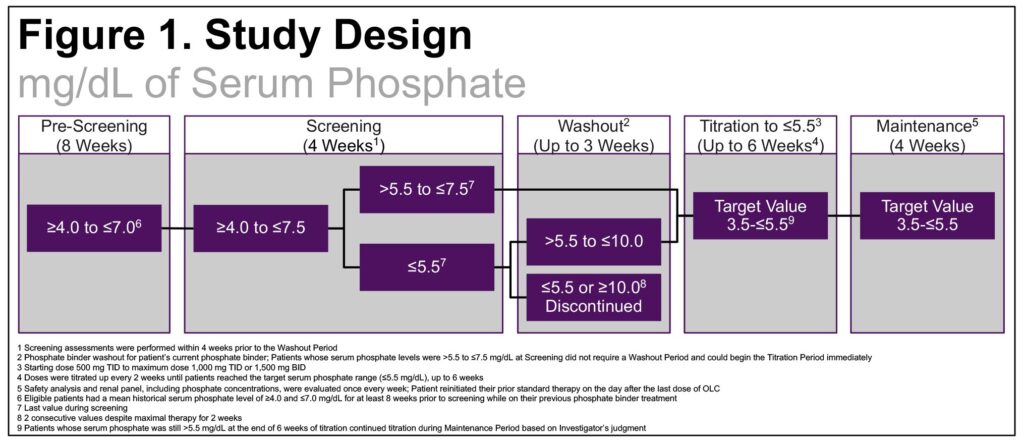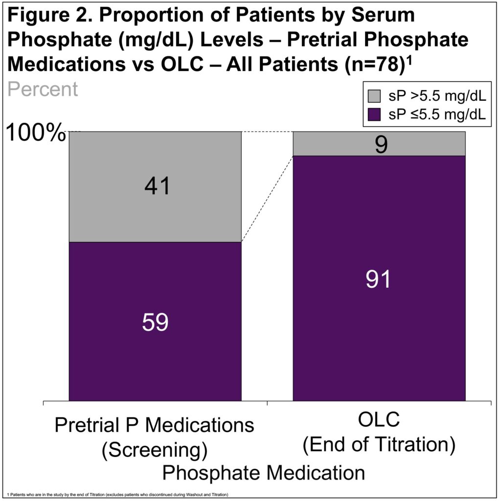 - The sP was ≤5.5 mg/dL at screening in 59% of pts and at the end of OLC titration in 91% of pts (Figure 2)