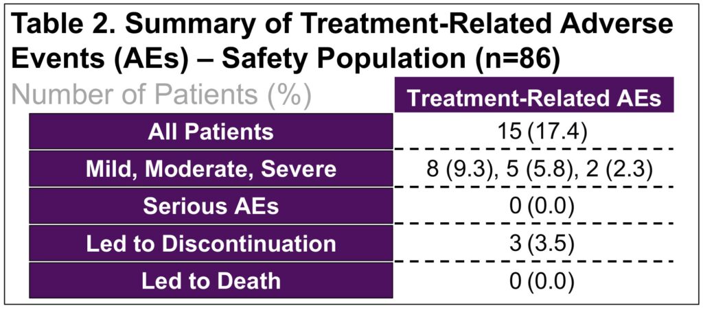 - Severe AEs, as assessed by investigators, were reported in one patient with upper abdominal pain and one with diarrhea